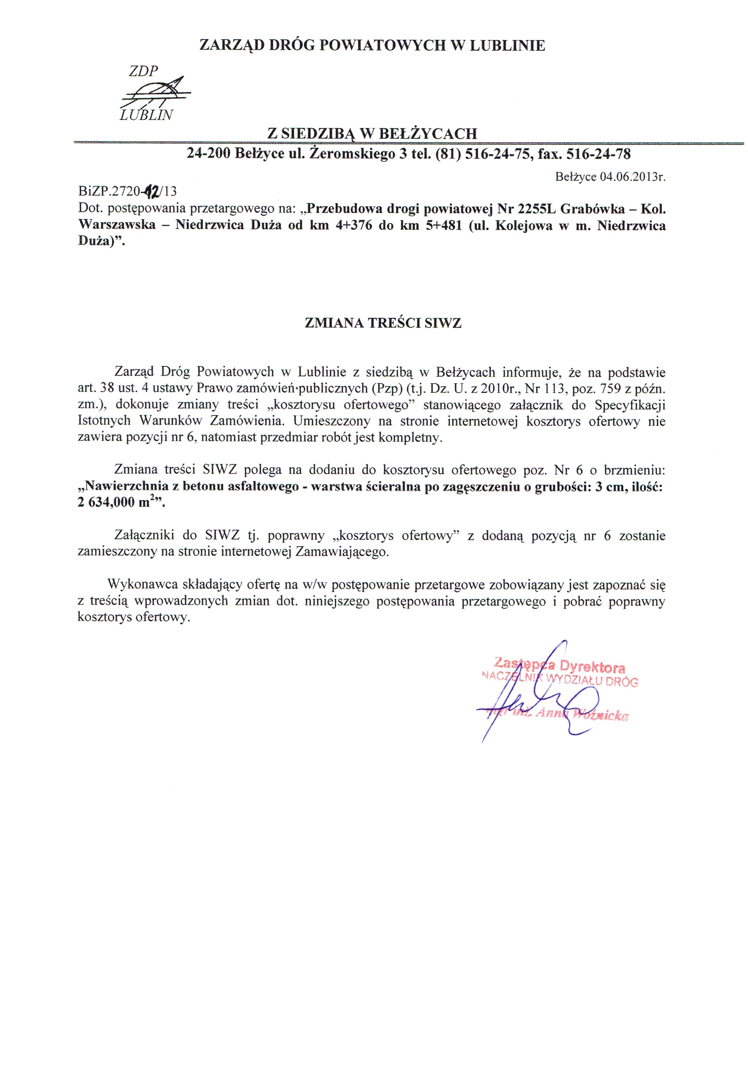 I. 1) NAZWA I ADRES: Zarząd Dróg Powiatowych w Lublinie z/s w Bełżycach , ul. Żeromskiego 3, 24-200 Bełżyce, woj. lubelskie, tel. 081 5162475, 5162885, faks 081 5162478.